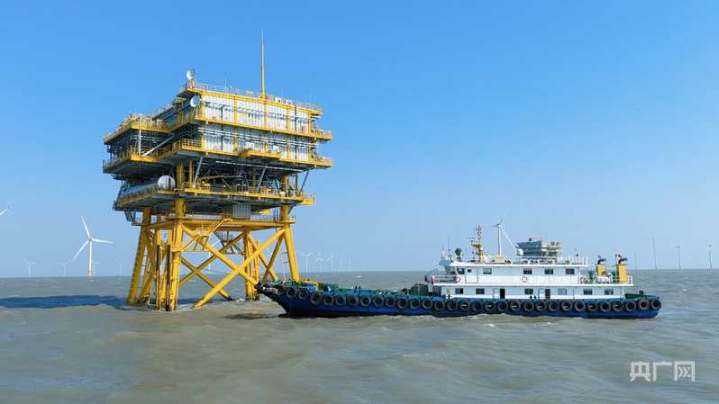 如果说风机是捕获风能的“手臂”,那么屹立于波涛之中的海上升压站,则是“整个风电场的心脏”。这个重达2000多吨的钢铁堡垒,在陆上整体建造完成后,被一次性吊装至海上导管架基础上。“风机发出的66千伏电能,要经过这颗‘心脏’汇集、升压至220千伏,才能通过海底电缆输送到陆地集控中心,并入国家电网。”桂伟介绍。